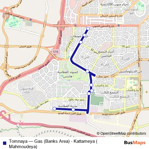 The first stop of the Tomnaya bus route is Mahmoudeya Station and the last stop is Gas (5th Settlement). Tomnaya (Gas (Banks Area) - Kattameya (Mahmoudeya)) is operational during everyday.