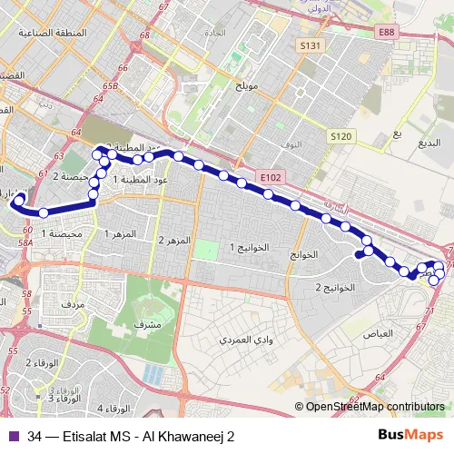 The first stop of the 34 bus route is Etisalat Bus Station 18 and the last stop is Al Khawaneej 2, Industrial Area 4 - 2. 34 (Etisalat MS - Al Khawaneej 2) is operational during everyday.