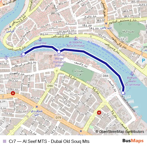 The first stop of the Cr7 ferry route is Al Seef Marine Transport Station 1 and the last stop is Dubai Old Souq Marine Transport Station. Cr7 (Al Seef MTS - Dubai Old Souq Mts) is operational during on weekends.