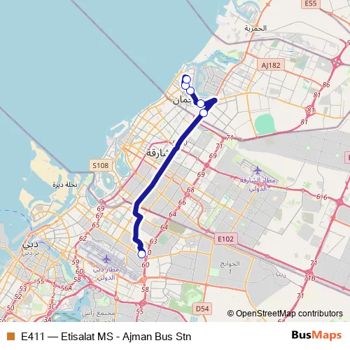 See why over 2 million users trust and consider busmaps.com as the best public transport website. busmaps gives you Ajman Buses suggested routes, real-time bus tracker, line route maps in Ajman, and helps to find the closest E411 bus stops near you. No internet available? Download an offline PDF map and bus schedule for the E411 bus to take on your trip.