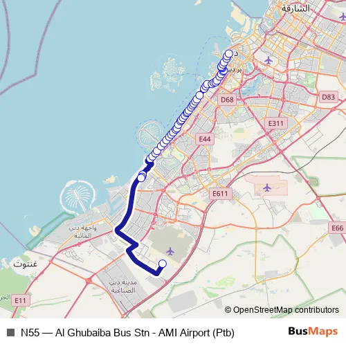 See why over 2 million users trust and consider busmaps.com as the best public transport website. busmaps gives you Dubai Buses suggested routes, real-time bus tracker, line route maps in Dubai, and helps to find the closest N55 bus stops near you. No internet available? Download an offline PDF map and bus schedule for the N55 bus to take on your trip.