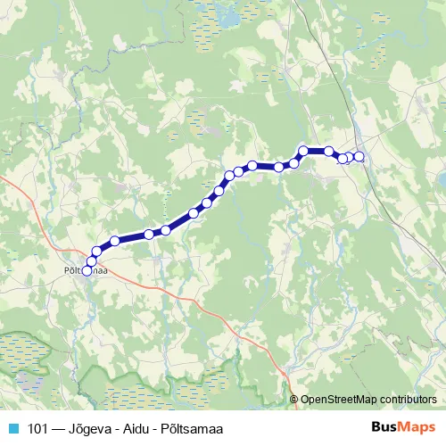 The first stop of the 101 bus route is Jõgeva and the last stop is Põltsamaa. 101 (Jõgeva - Aidu - Põltsamaa) is operational during everyday.