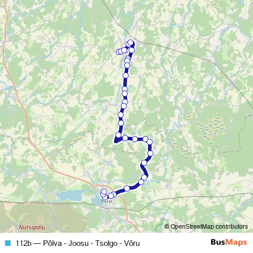 The first stop of the 112b bus route is Põlva bussijaam and the last stop is Võru bussijaam. 112b (Põlva - Joosu - Tsolgo - Võru) is operational during on weekends.