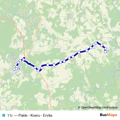 The first stop of the 11c bus route is Ervita and the last stop is Paide bussijaam 6. 11c (Paide - Koeru - Ervita) is operational during everyday.