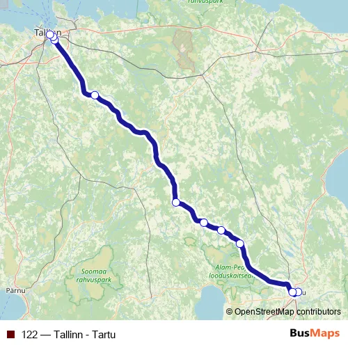The first stop of the 122 bus route is Tartu bussijaam and the last stop is Tallinna bussijaam. 122 (Tallinn - Tartu) is operational during everyday.