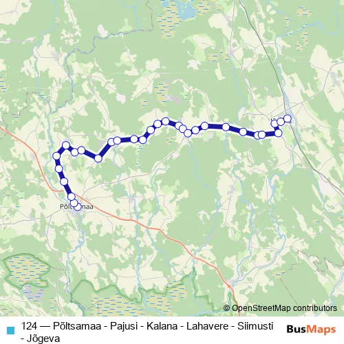 The first stop of the 124 bus route is Põltsamaa and the last stop is Jõgeva. 124 (Põltsamaa - Pajusi - Kalana - Lahavere - Siimusti - Jõgeva) is operational during everyday.