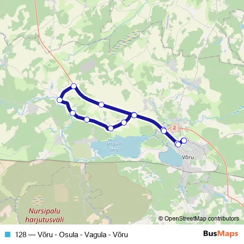 The first stop of the 128 bus route is Võru bussijaam and the last stop is Võru bussijaam. 128 (Võru - Osula - Vagula - Võru) is operational during on weekdays.