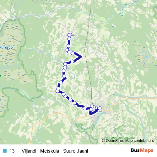 The first stop of the 13 bus route is Viljandi bussijaam and the last stop is Suure-Jaani. 13 (Viljandi - Metsküla - Suure-Jaani) is operational during on weekdays.