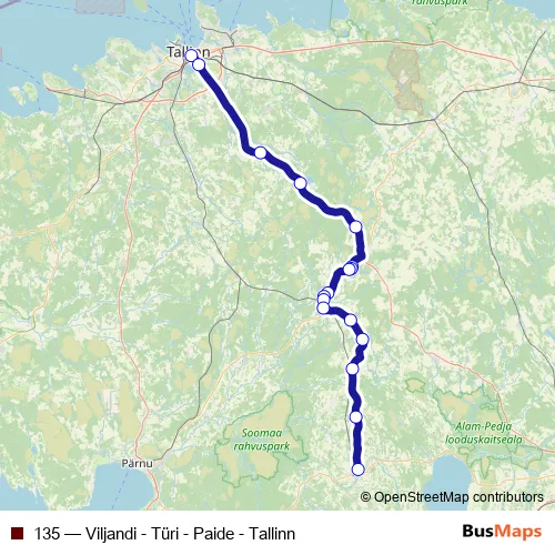 The first stop of the 135 bus route is Tallinna bussijaam and the last stop is Viljandi bussijaam. 135 (Viljandi - Türi - Paide - Tallinn) is operational during everyday.