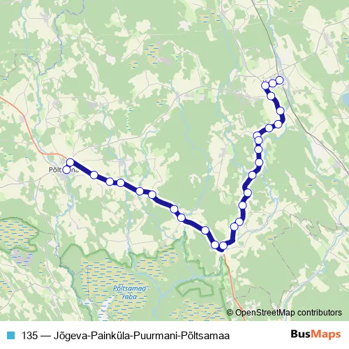 The first stop of the 135 bus route is Jõgeva and the last stop is Põltsamaa. 135 (Jõgeva-Painküla-Puurmani-Põltsamaa) is operational during everyday.