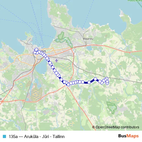 The first stop of the 135a bus route is Aruküla mõis and the last stop is Balti jaam (train station). 135a (Aruküla - Jüri - Tallinn) is operational during everyday.