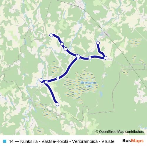 The first stop of the 14 bus route is Kunksilla and the last stop is Viluste. 14 (Kunksilla - Vastse-Koiola - Verioramõisa - Viluste) is operational during on weekdays.