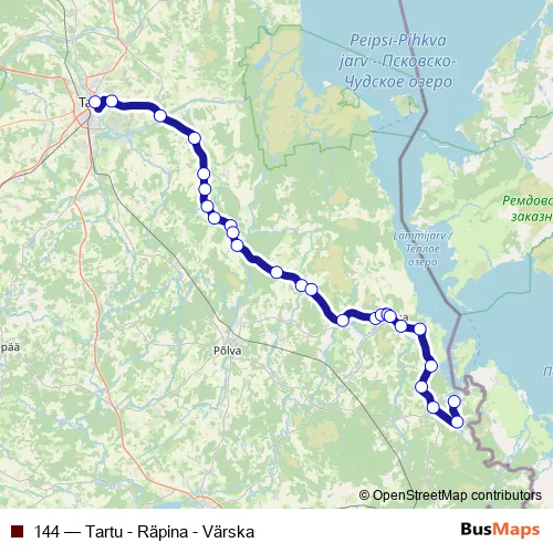 The first stop of the 144 bus route is Tartu bussijaam and the last stop is Värska sanatoorium. 144 (Tartu - Räpina - Värska) is operational during on weekends.