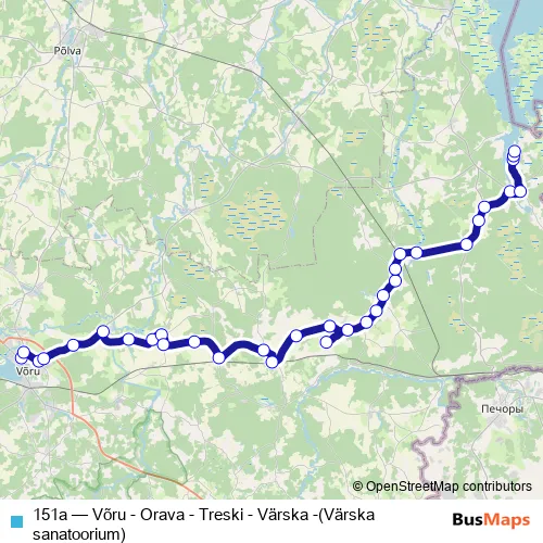 The first stop of the 151a bus route is Kesklinn and the last stop is Värska sanatoorium. 151a (Võru - Orava - Treski - Värska -(Värska sanatoorium)) is operational during on weekdays.