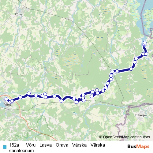 The first stop of the 152a bus route is Võru bussijaam and the last stop is Värska sanatoorium. 152a (Võru - Lasva - Orava - Värska - Värska sanatoorium) is operational during on weekdays.