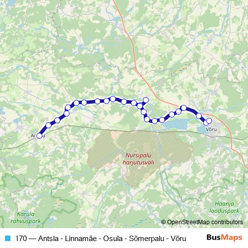 The first stop of the 170 bus route is Antsla and the last stop is Võru bussijaam. 170 (Antsla - Linnamäe - Osula - Sõmerpalu - Võru) is operational during on weekends.