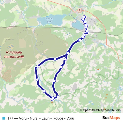 The first stop of the 177 bus route is Võru bussijaam and the last stop is Võru bussijaam. 177 (Võru - Nursi - Lauri - Rõuge - Võru) is operational during on weekdays.