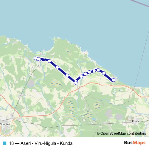 The first stop of the 18 bus route is Aseri and the last stop is Kunda pargi. 18 (Aseri - Viru-Nigula - Kunda) is operational during everyday.
