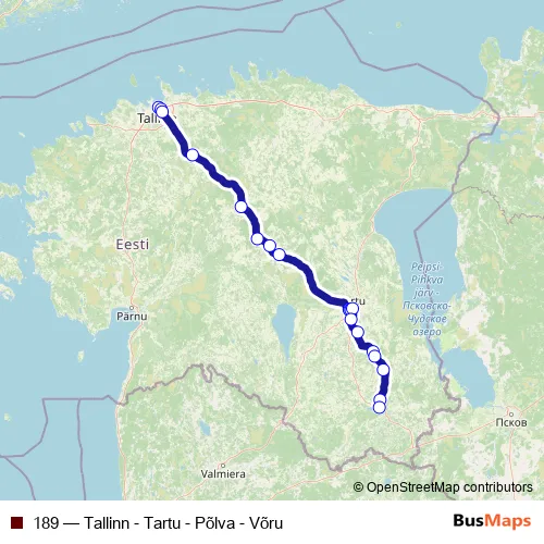 The first stop of the 189 bus route is Tallinna bussijaam and the last stop is Võru bussijaam. 189 (Tallinn - Tartu - Põlva - Võru) is operational during everyday.
