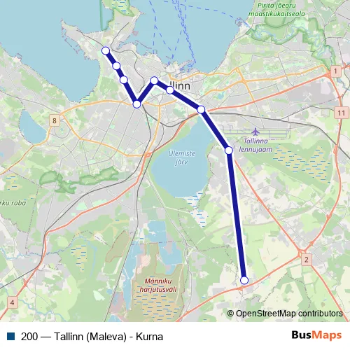 The first stop of the 200 bus route is Kangrumetsa and the last stop is Maleva. 200 (Tallinn (Maleva) - Kurna) is operational during everyday.