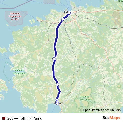 The first stop of the 203 bus route is Tallinna bussijaam and the last stop is Pärnu bussijaam. 203 (Tallinn - Pärnu) is operational during everyday.