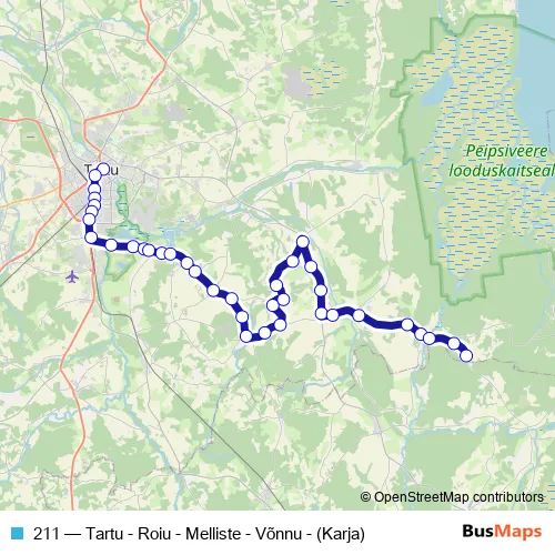 The first stop of the 211 bus route is Tartu bussijaam and the last stop is Karja. 211 (Tartu - Roiu - Melliste - Võnnu - (Karja)) is operational during on weekdays.