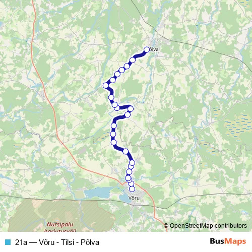 The first stop of the 21a bus route is Võru bussijaam and the last stop is Põlva bussijaam. 21a (Võru - Tilsi - Põlva) is operational during everyday.