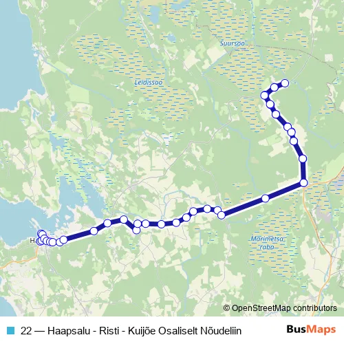 The first stop of the 22 bus route is Haapsalu bussijaam and the last stop is Risti. 22 (Haapsalu - Risti - Kuijõe Osaliselt Nõudeliin) is operational during everyday.