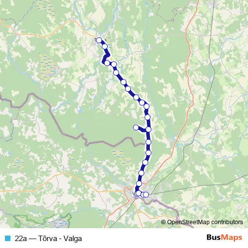 The first stop of the 22a bus route is Tõrva and the last stop is Valga bussijaam. 22a (Tõrva - Valga) is operational during everyday.