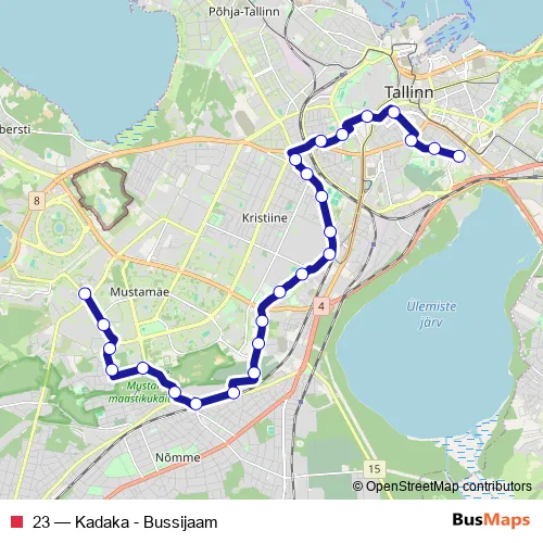 The first stop of the 23 bus route is Bussijaam (bus station) and the last stop is Kadaka. 23 (Kadaka - Bussijaam) is operational during everyday.
