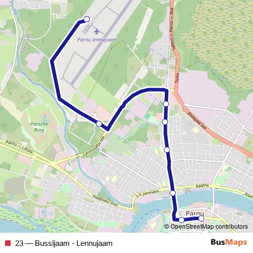 The first stop of the 23 bus route is Lennujaam and the last stop is Bussijaam. 23 (Bussijaam - Lennujaam) is operational during everyday.