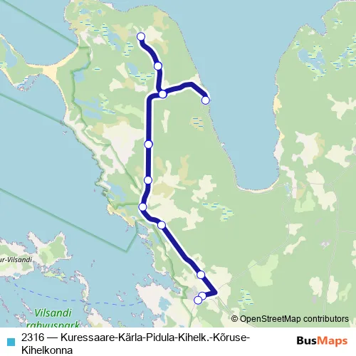 The first stop of the 2316 bus route is Kõruse and the last stop is Kihelkonna. 2316 (Kuressaare-Kärla-Pidula-Kihelk.-Kõruse-Kihelkonna) is operational during on weekdays.