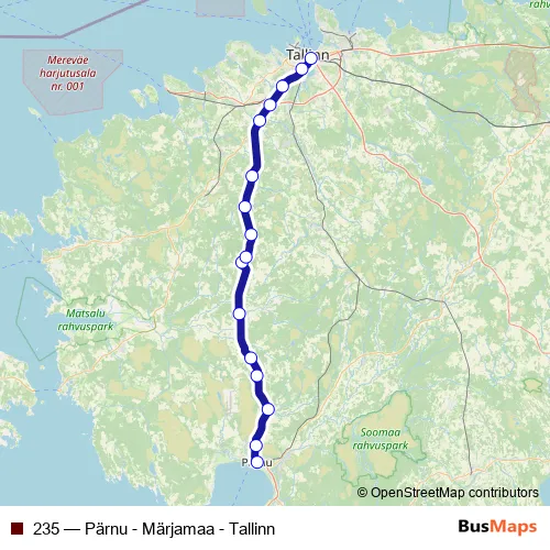 The first stop of the 235 bus route is Pärnu bussijaam and the last stop is Tallinna bussijaam. 235 (Pärnu - Märjamaa - Tallinn) is operational during everyday.