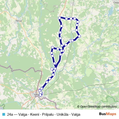 The first stop of the 24a bus route is Valga bussijaam and the last stop is Valga bussijaam. 24a (Valga - Keeni - Priipalu - Uniküla - Valga) is operational during everyday.