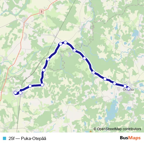 The first stop of the 25f bus route is Puka kool and the last stop is Otepää. 25f (Puka-Otepää) is operational during on weekdays.