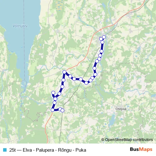 The first stop of the 25t bus route is Elva and the last stop is Puka. 25t (Elva - Palupera - Rõngu - Puka) is operational during everyday.