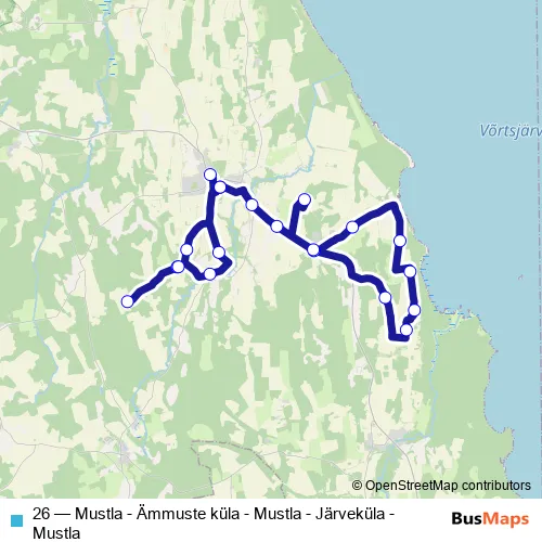 The first stop of the 26 bus route is Tarvastu gümnaasium and the last stop is Mustla. 26 (Mustla - Ämmuste küla - Mustla - Järveküla - Mustla) is operational during on weekdays.