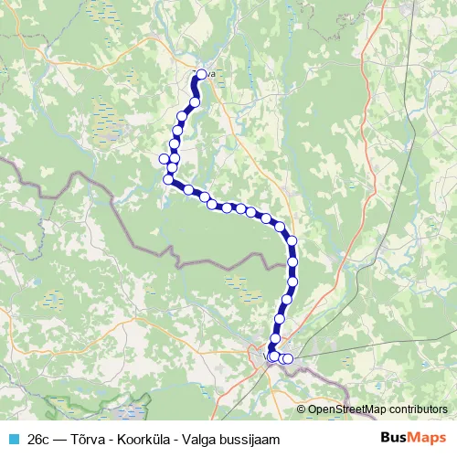The first stop of the 26c bus route is Tõrva and the last stop is Valga bussijaam. 26c (Tõrva - Koorküla - Valga bussijaam) is operational during everyday.