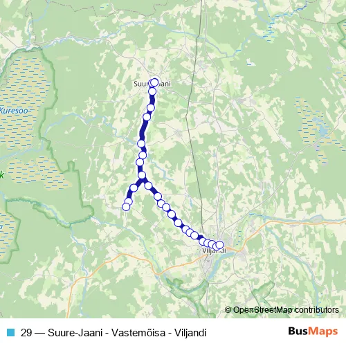 The first stop of the 29 bus route is Suure-Jaani and the last stop is Viljandi bussijaam. 29 (Suure-Jaani - Vastemõisa - Viljandi) is operational during everyday.