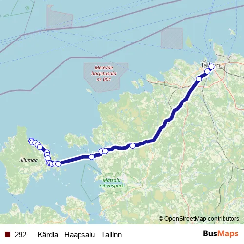 The first stop of the 292 bus route is Kärdla bussijaam and the last stop is Tallinna bussijaam. 292 (Kärdla - Haapsalu - Tallinn) is operational during everyday.