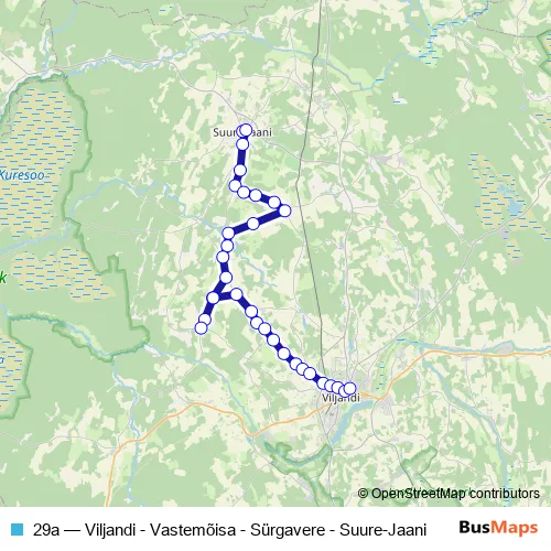 The first stop of the 29a bus route is Suure-Jaani and the last stop is Viljandi bussijaam. 29a (Viljandi - Vastemõisa - Sürgavere - Suure-Jaani) is operational during everyday.