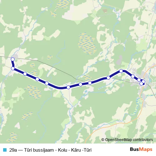 The first stop of the 29a bus route is Käru and the last stop is Türi bussijaam. 29a (Türi bussijaam - Kolu - Käru -Türi) is operational during on weekdays.