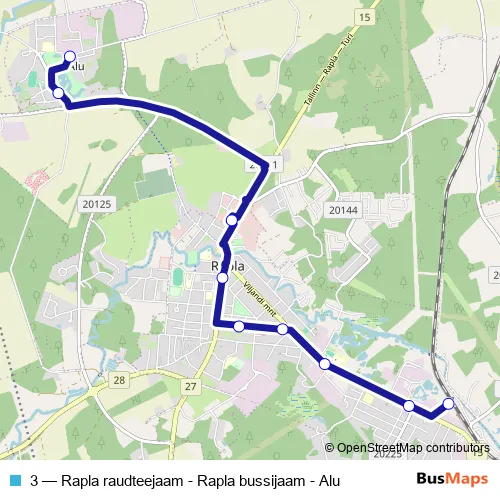 The first stop of the 3 bus route is Alu and the last stop is Rapla raudteejaam. 3 (Rapla raudteejaam - Rapla bussijaam - Alu) is operational during everyday.