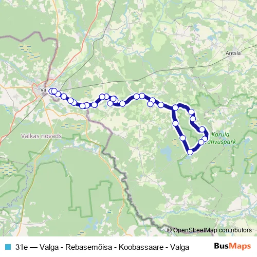 The first stop of the 31e bus route is Valga bussijaam and the last stop is Valga bussijaam. 31e (Valga - Rebasemõisa - Koobassaare - Valga) is operational during everyday.