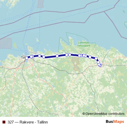 The first stop of the 327 bus route is Rakvere bussijaam and the last stop is Tallinna bussijaam. 327 (Rakvere - Tallinn) is operational during on weekends.