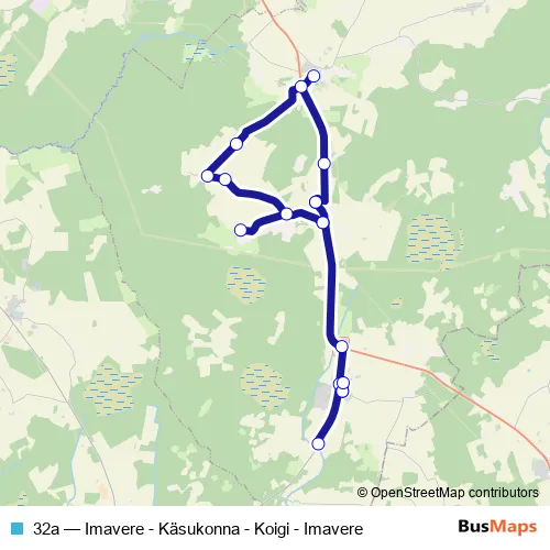 The first stop of the 32a bus route is Imavere and the last stop is Imavere lasteaed. 32a (Imavere - Käsukonna - Koigi - Imavere) is operational during on weekdays.