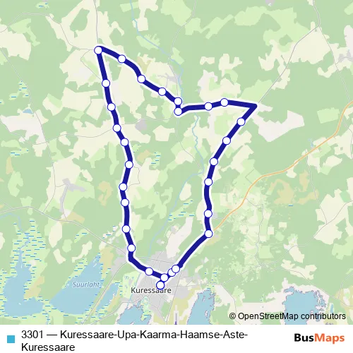 The first stop of the 3301 bus route is Kuressaare (5) and the last stop is Kuressaare. 3301 (Kuressaare-Upa-Kaarma-Haamse-Aste-Kuressaare) is operational during everyday.