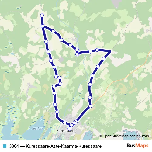 The first stop of the 3304 bus route is Kuressaare (5) and the last stop is Kuressaare. 3304 (Kuressaare-Aste-Kaarma-Kuressaare) is operational during on weekdays.