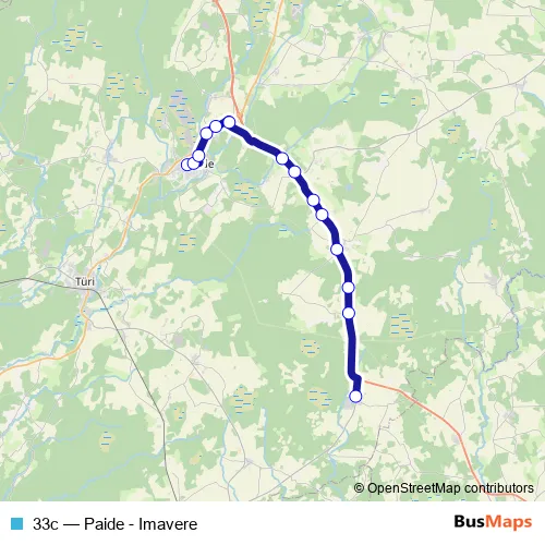 The first stop of the 33c bus route is Paide bussijaam 3 and the last stop is Imavere. 33c (Paide - Imavere) is operational during everyday.