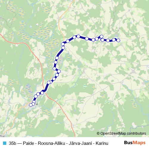 The first stop of the 35b bus route is Karinu and the last stop is Paide bussijaam 6. 35b (Paide - Roosna-Alliku - Järva-Jaani - Karinu) is operational during everyday.